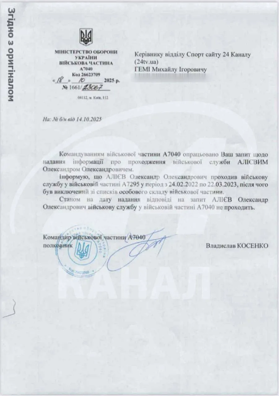Офіційна відповідь 112 бригади щодо служби Алієва / фото 24 Каналу