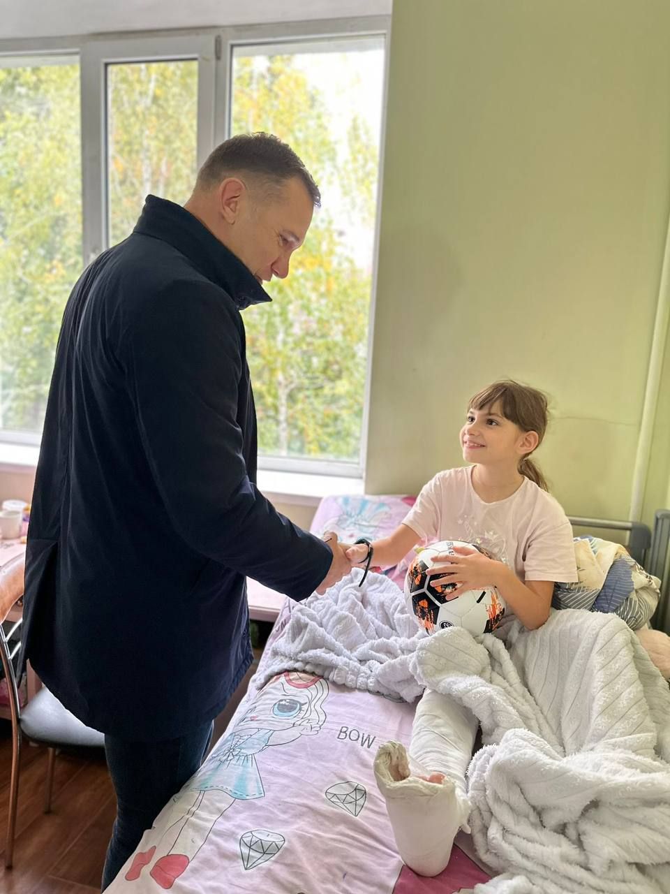 Обійшли реабілітаційне, реанімаційне та травматологічне відділення. Почесний гість подарував дітям м’ячі з власним автографом та інші корисні подарунки. Це стало приємним сюрпризом для маленьких футболістів і фанатів,