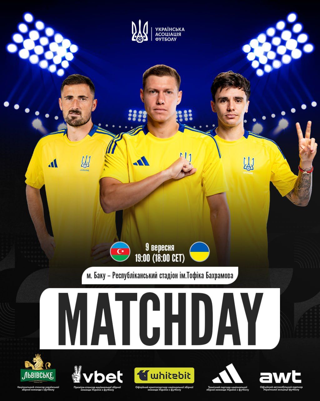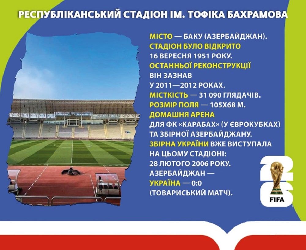 Поєдинок проти Азербайджану збірна України зіграє у Баку на Республіканському стадіоні імені Тофіка Бахрамова. Зустріч розпочнеться о 19:00 за київським часом, пише 24 Канал.