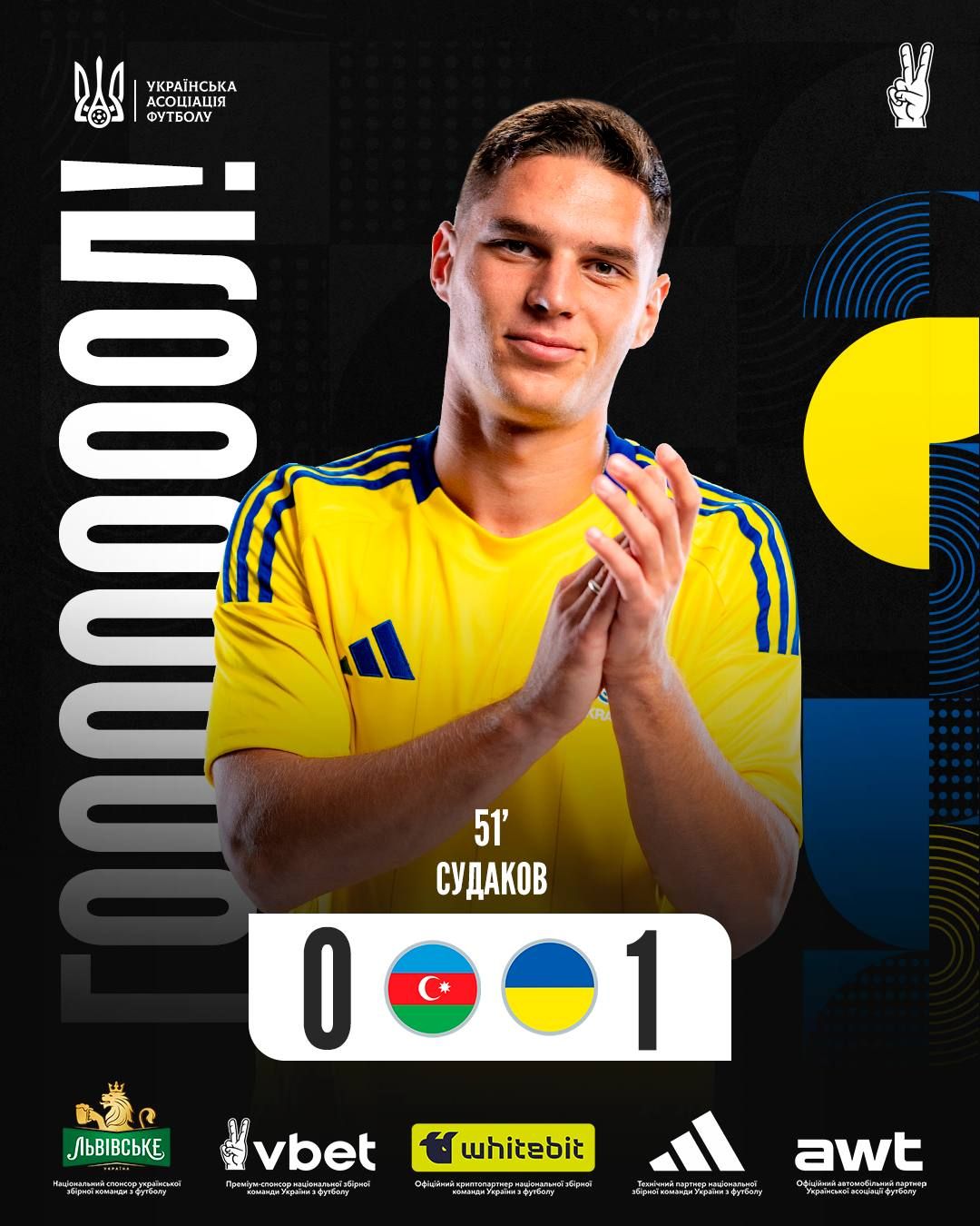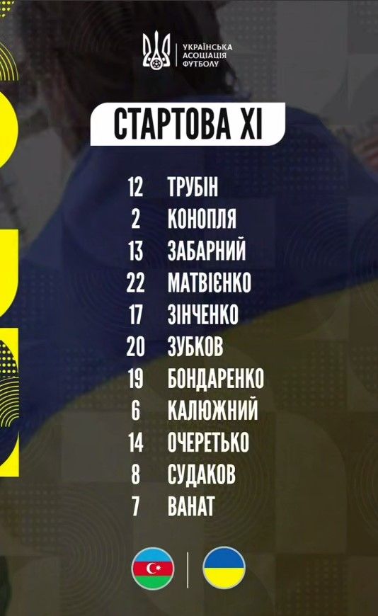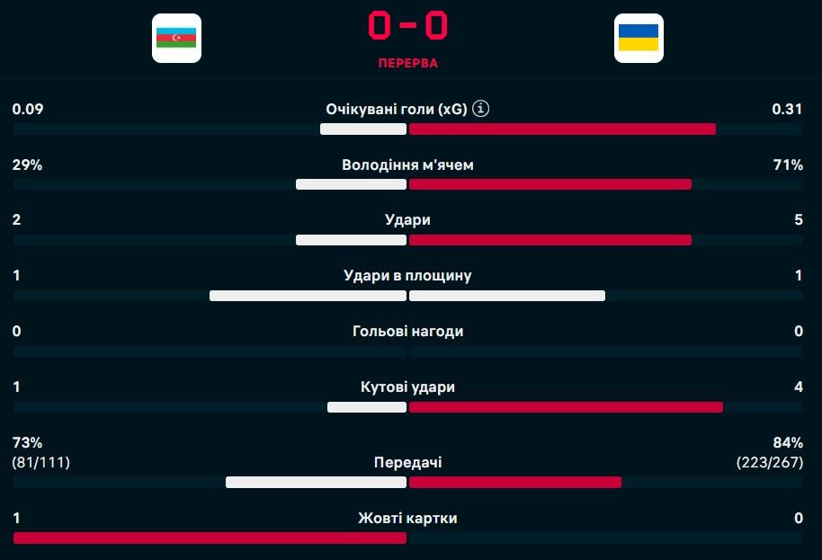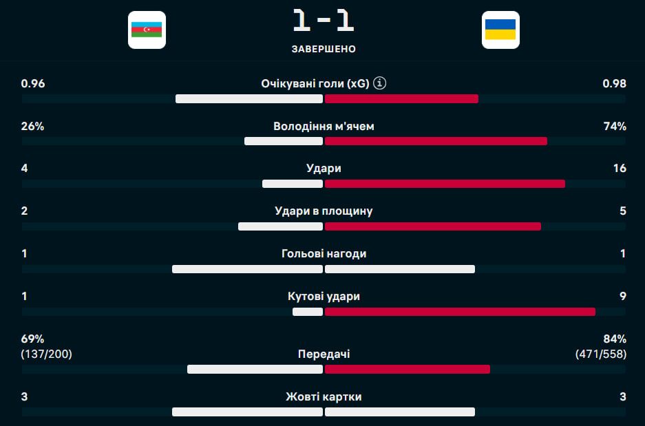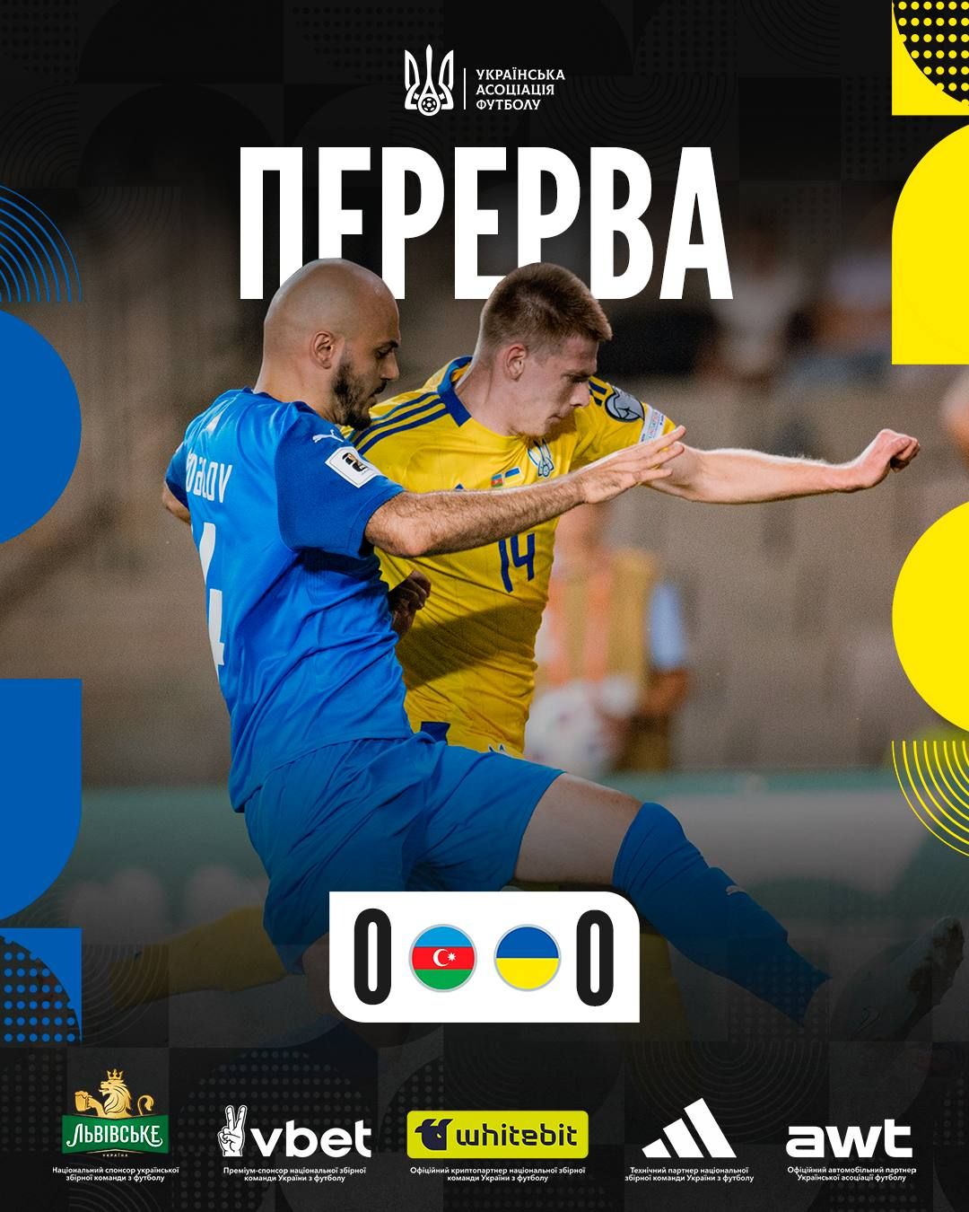 Кіпер рятує Азербайджан після дальніх ударів Волошина та Шапаренка. Жовта картка воротарю Азербайджану за затягування часу. Матвієнко пробив вище воріт. Жовта картка Шапаренку за удар ззаду по гравцю Азербайджану. Шість хвилин компенсував рефері. Довбик пробив вище після подачі від Судакова. Неточний удар головою від Матвієнка після подачі з флангу. Україна притисла суперника до воріт, але не може створити гостроту. Михайліченко вийшов замість Зінченка. Махмудов скосив Шапаренка в центрі поля, за що отримує "гірчичник". Голкіпер забирає м'яч після дальнього удару Зубкова. У Азербайджану вийшов Абдуллазаде замість Хайбулаєва. Дві заміни від Реброва. Очеретько та Бондаренко поступаються місцями на полі Волошину та Шапаренку. Судаков віддавав на забігання Зінченку, але нашого гравця випередив захисник господарів. ГОЛ. Махмудов пробиває точно, Трубін не дістає до м'яча. Рахунок 1:1. Відео голу: Жовта картка Зінченку. Три заміни від господарів. Нурієв, Гурбанли та Гусейнов вийшли замість Дадашова, Емрелі та Алієва. Захисник азербайджанців грубо скосив Бондаренка, але не отримав жодного покарання за це. Дві заміни від Реброва. Ванат та Калюжний йдуть з поля, замість них вийшли Ярмолюк та Довбик. Калюжний грубо зіграв проти Хайбулаєва та отримав жовту картку. Замість Ахмедзаде вийшов Байрамов. Непоганий дальній удар від Судакова заблокував захисник. Дальній удар Зубкова, м'яч в руках кіпера. Небезпечний удар Бондаренка заблокував Джафаргулієв. Суддя додав три хвилини. Дадашов стрибнув ногою в голову Трубіну, за що отримав жовту картку. Емрелі пробив значно вище воріт після навісу з флангу. Небезпечний удар Махмудова зі стандарту! Трубін витягує м'яч з-під поперечини. Трубін забирає м'яч у Емрелі, який не зміг обробити м'яч після закидання. Класне закидання від Судакова на Зубкова, але нашого вінгера випередив воротар Азербайджану. Закидання від Забарного не знайшло адресата. М'яч у воротаря азербайджанців. Махмудов грубо в'їхав у Ваната ззаду, але суддя вирішив не фіксувати фол. М'яч контролюється в центрі поля. Глибокий захист господарів поки не підпускає Україну до свої воріт. Дадашову не дали прийняти м'яч та створити небезпеку біля воріт Трубіна. Ванат хитро виводив Судакова на ударну позицію. Гравець Бенфіки трохи не встиг до м'яча, Кривоцюк його випередив. Затяжна атака України завершилась неточним пасом Судакова на Зінченка. Неточний удар Судакова з-за меж карного майданчика. Захисник збірної Азербайджану заблокував простріл Судакова. Жовта картка Мустафазаде. Пенальті! Ванат втікав від Мустафазаде і азербайджанець звалив гравця Жирони у власному майданчику. Як виглядає стадіон в Баку перед матчем:Огляд матчу