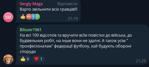 - Вручити всім повістки до війська, до будівельних робіт. На інше вони не здатні. А також усім "професіоналам" федерації футболу, хай будують обороні споруди.
