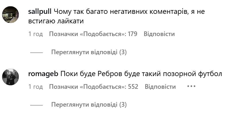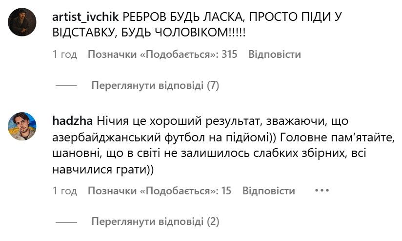 У коментарях на спортивних сайтах, а також в інстаграмі УАФ, фанати активно знищують збірну України. Найбільше ж дістається Сергію Реброву, якого закликають піти у відставку.