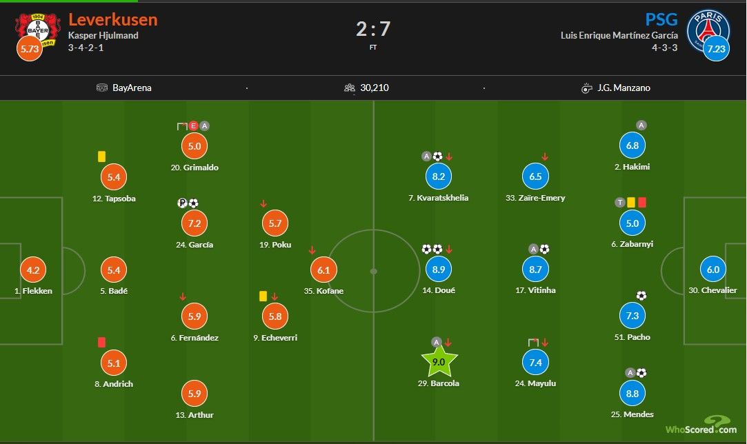 Оцінки за матч Баєр – ПСЖ / Скриншот із сайту WhoScored