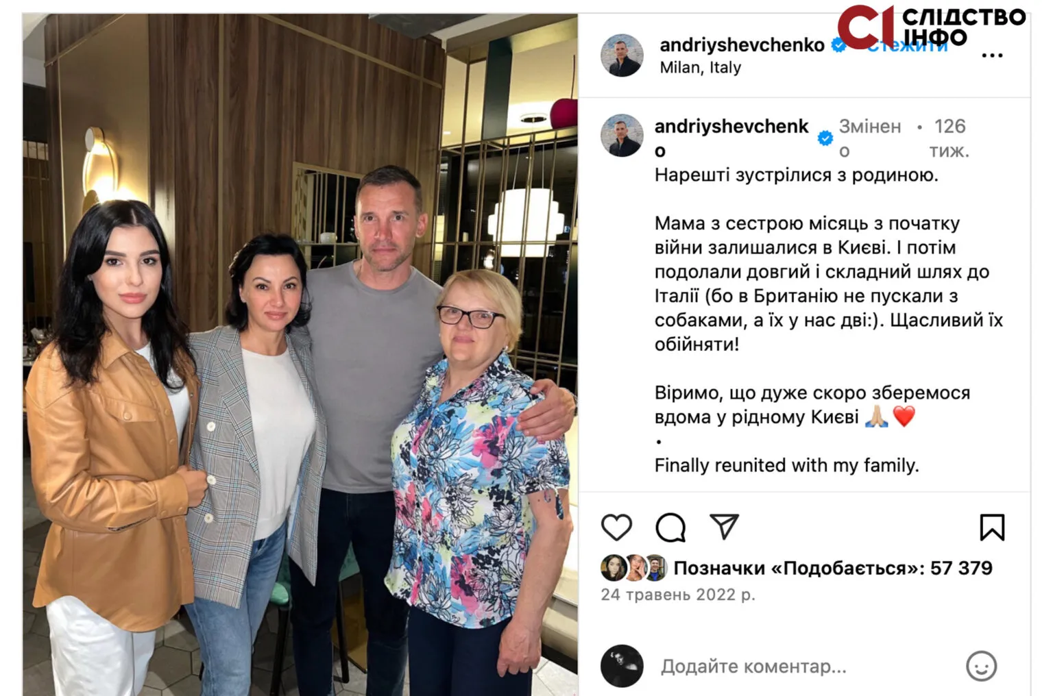 Проте брат Олени – Андрій Шевченко у травні 2022 року на своїй сторінці у фейсбуці опублікував спільне фото з родиною. На локації світлини вказано місто Мілан.