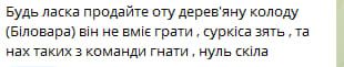 - Будь ласка продайте оту дерев'яну колоду (Біловара) він не вміє грати, Суркіса зять, таких з команди гнати, нуль скіла.