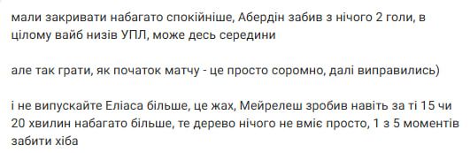 - Мали закривати набагато спокійніше, Абердін забив з нічого 2 голи, в цілому вайб низів УПЛ, може десь середини, але так грати, як початок матчу – це просто соромно, далі виправились. І не випускайте Еліаса більше, це жах, Мейрелеш зробив навіть за ті 15 чи 20 хвилин набагато більше, те дерево нічого не вміє просто, 1 з 5 моментів забити хіба.