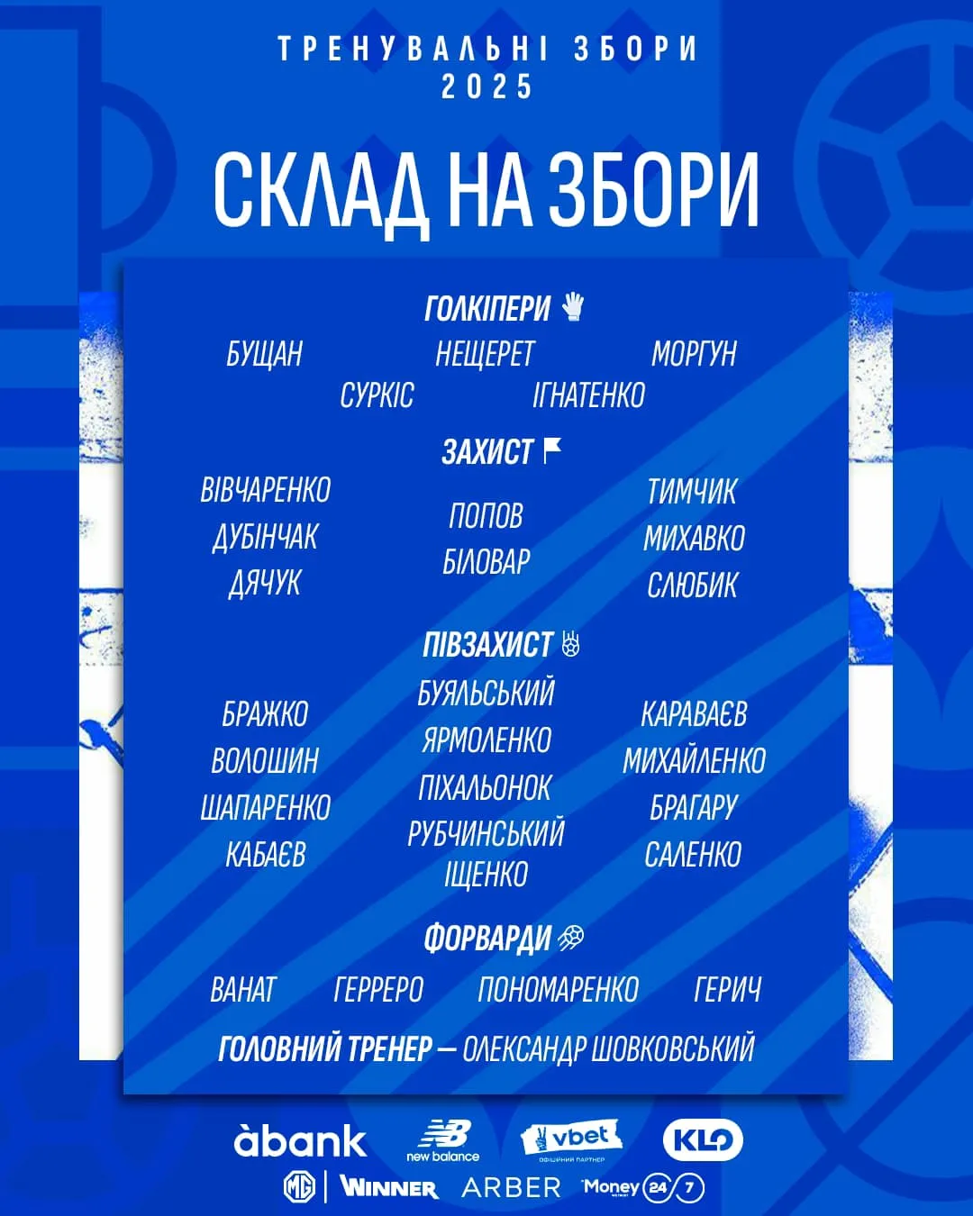 - Нападники: Владислав Ванат, Едуардо Герреро, Матвій Пономаренко, Владислав Герич.
