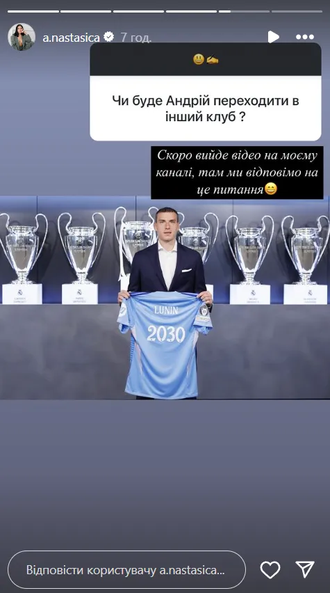 У своєму інстаграмі Анастасія Луніна натякнула вболівальникам українського воротаря Реала про можливий відхід Андрія з команди. Однак, деталі щодо переходу в інший клуб дівчина вирішила не розкривати.