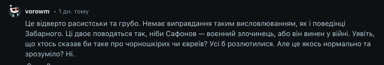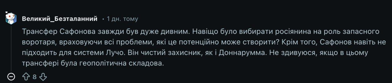 Французи ж при цьому поділилися на декілька таборів. Деякі називали Іллю та його дружину чомусь расистами, адже Сафонов не "причетний до війни", а хтось навпаки підтримує та пояснював, що Україна отримує щодня неймовірно велику кількість горя від ворога, тому таке ставлення до росіян є максимально зрозумілим.