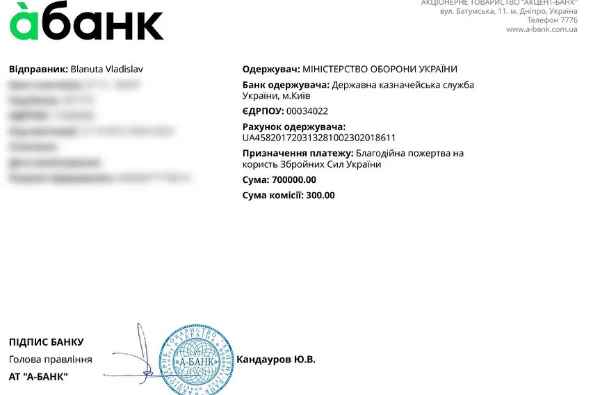 Квитанція банківського чека / Фото з інстаграму Бленуце