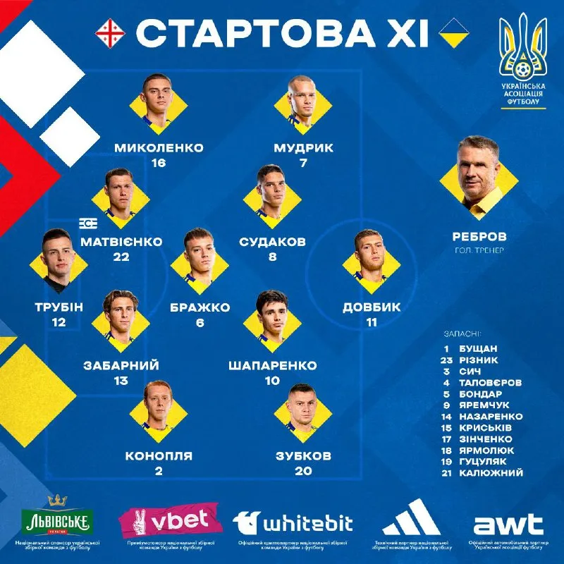 - Стартовий склад збірної України: Анатолій Трубін – Юхим Конопля, Ілля Забарний, Микола Матвієнко (к), Віталій Миколенко – Володимир Бражко, Микола Шапаренко, Георгій Судаков – Олександр Зубков, Михайло Мудрик, Артем Довбик.