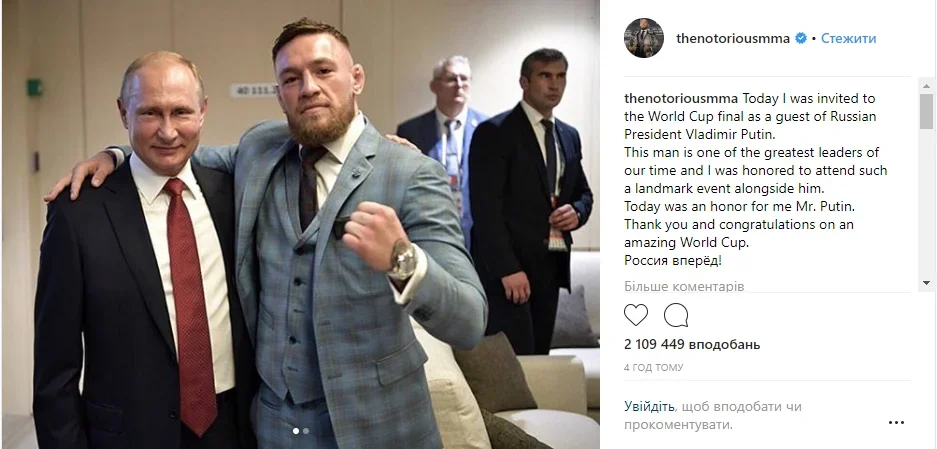 Зустріч Конора МакГрегора з президентом Росії Володимиром Путіним відбулася під час фіналу ЧС-2018. У себе в інстаграмі ірландець опублікував спільне фото з кривавим диктатором і висловив своє захоплення цим злочинцем.