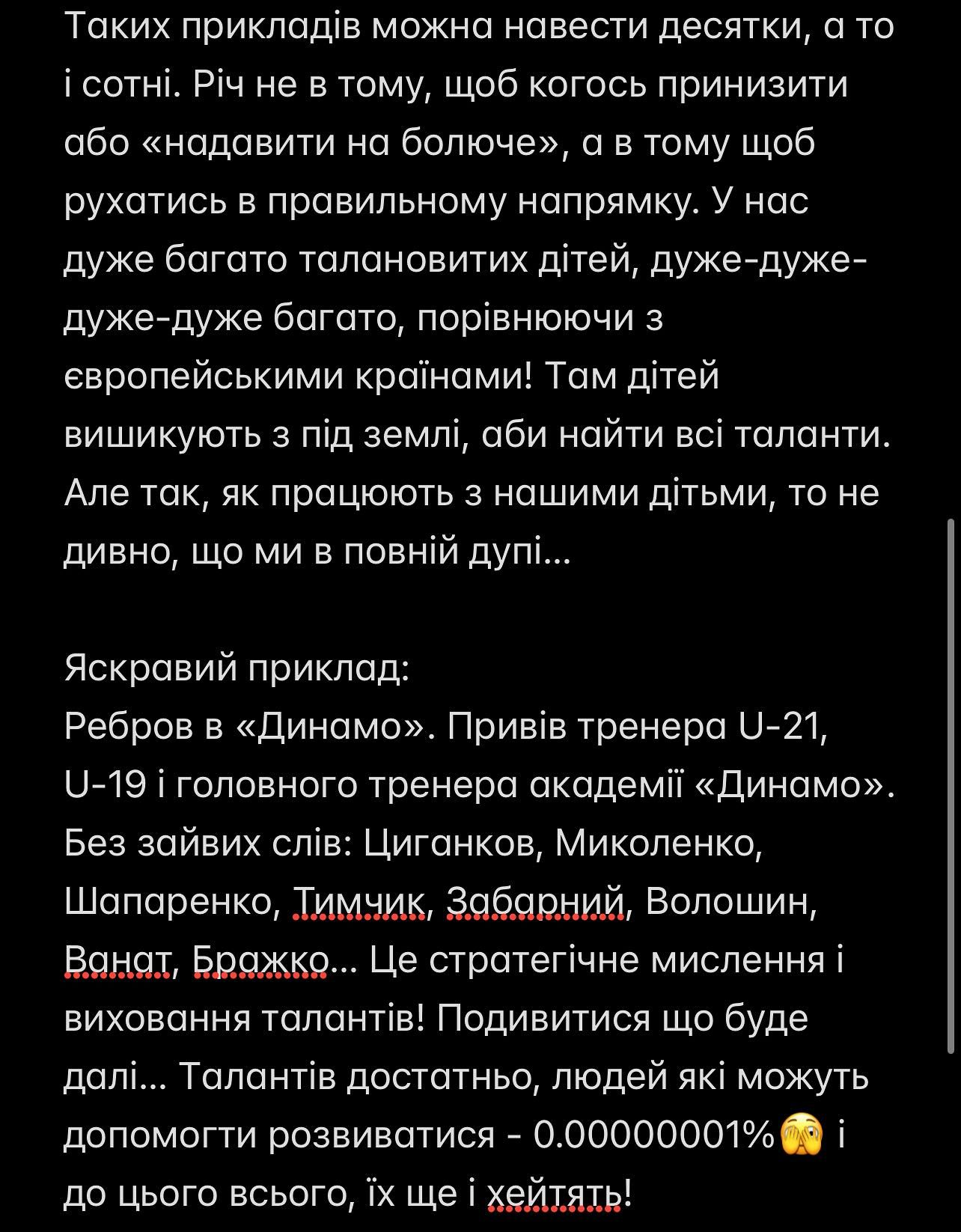 "Яскравий приклад: Ребров в Динамо. Привів тренера U-21, U-19 і головного тренера академії Динамо. Без зайвих слів: Циганков, Миколенко, Шапаренко, Тимчик, Забарний, Волошин, Ванат, Бражко... Це стратегічне мислення і виховання талантів! Подивитися що буде далі... Талантів достатньо, людей, які можуть допомогти розвиватися – 0,00000001% i до цього всього, їх ще і хейтять!", – зазначив Кравець.