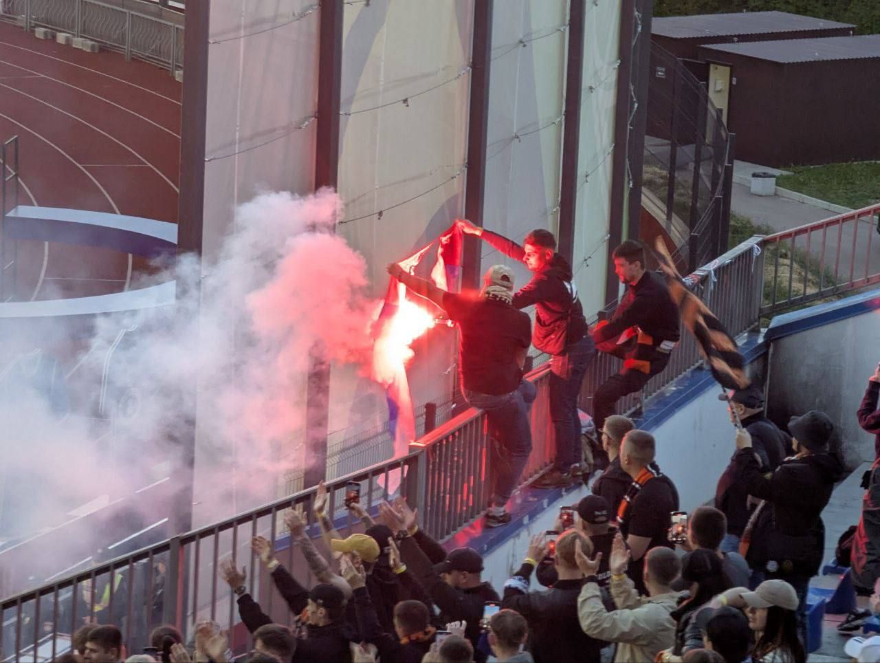 Вболівальники донецького клубу спалили прапори Росії та терористичної організації "ДНР". Це викликало бурхливі оплески глядачів на трибунах.