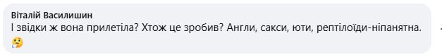 - "І звідки ж вона прилетіла? Хтож це зробив? Англи, сакси, юти, рептілоїди-ніпанятна".