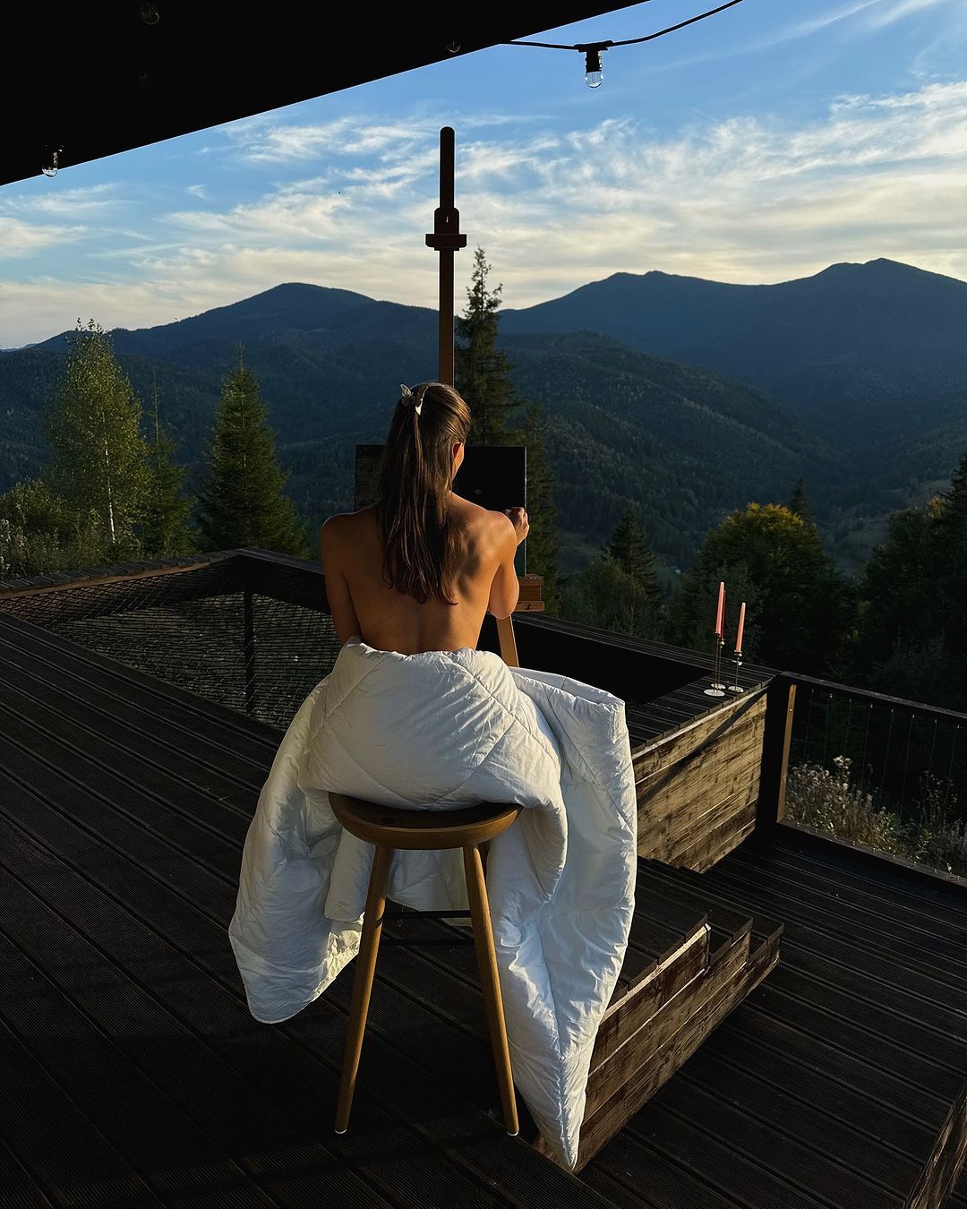 У своєму інстаграмі Марина Бех-Романчук поділилась світлинами з відпочинку в Карпатах. Українська спортсменка опублікувала фото, де вона сидить з оголеною верхньою частиною тіла та малює на полотні.