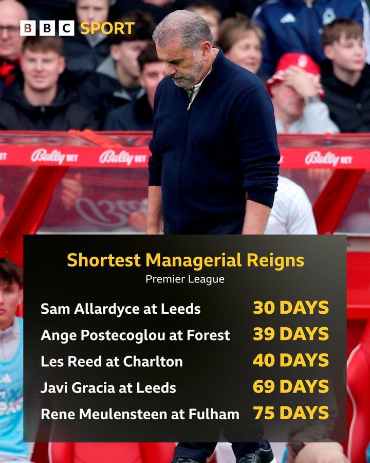 60-річний фахівець очолив Ноттінгем Форест 9 вересня 2025 року. На тренерському містку він протримався лише 39 днів. За даними Match of the Day, Постекоглу ледве не побив антирекорд АПЛ, який належить Сему Алардайсу. Англійський тренер працював з Лідсом 30 днів.
