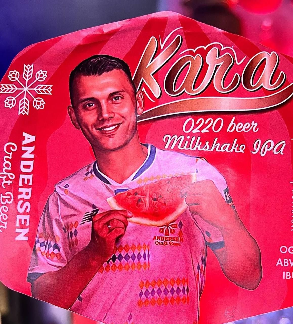 Назва пива – KARA 0220 Milkshake IPA. Воно має смак кавуна, що є відсилкою до рідного міста Караваєва. Світлий ель має кремову