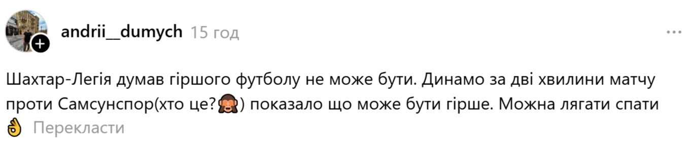 Особливу увагу вболівальники приділяють поразці Динамо. Вони акцентують на тому, що Самсунспор є невідомою командою і програвати їй було не можна. Вашій увазі підбірка найбільш яскравих коментарів щодо ігор киян та донеччан: