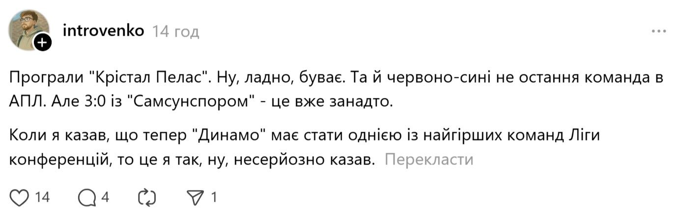 - Програли Крістал Пелес. Ну, ладно, буває. Та й "червоно-сині" не остання команда в АПЛ. Але 3:0 із Самсунспором – це вже занадто. Коли я казав, що тепер Динамо має стати однією із найгірших команд Ліги конференцій, то це я несерйозно казав.