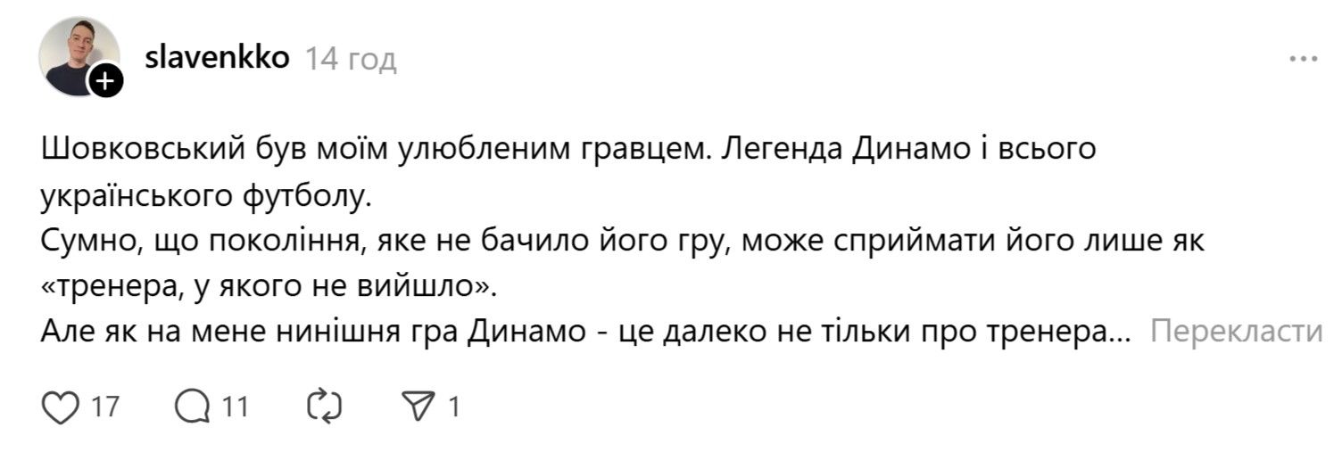- Шовковський був моїм улюбленим гравцем. Легенда Динамо і всього українського футболу. Сумно, що покоління, яке не бачило його гру, може сприймати його лише як "тренера, у якого не вийшло". Але нинішня гра Динамо – це далеко не тільки про тренера.