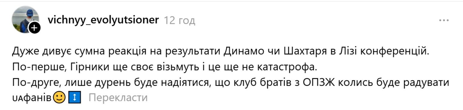 - Дуже дивує сумна реакція на результати Динамо чи Шахтаря в Лізі конференцій. По-перше, "гірники" ще своє візьмуть і це ще не катастрофа. По-друге, лише дурень буде надіятися, що клуб братів з ОПЗЖ колись буде радувати українських фанів.