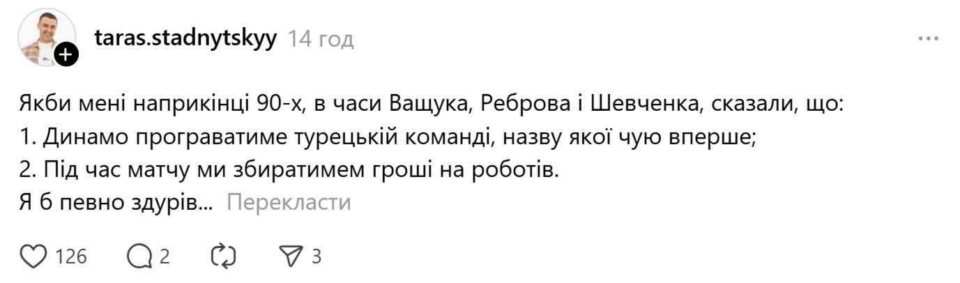 Долучився до обговорення і відомий комік Тарас Стадницький. Він порівняв поточний стан Динамо зі славетною командою 30-тирічної давнини.