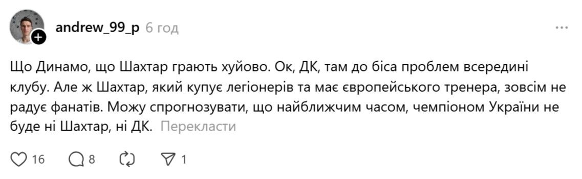 - Що Динамо, що Шахтар грають ху*ово. Ок, Динамо, там до біса проблем всередині клубу. Але ж Шахтар, який купує легіонерів та має європейського тренера, зовсім не радує фанатів. Прогнозую, що найближчим часом, чемпіоном України не буде ні Шахтар, ні Динамо.