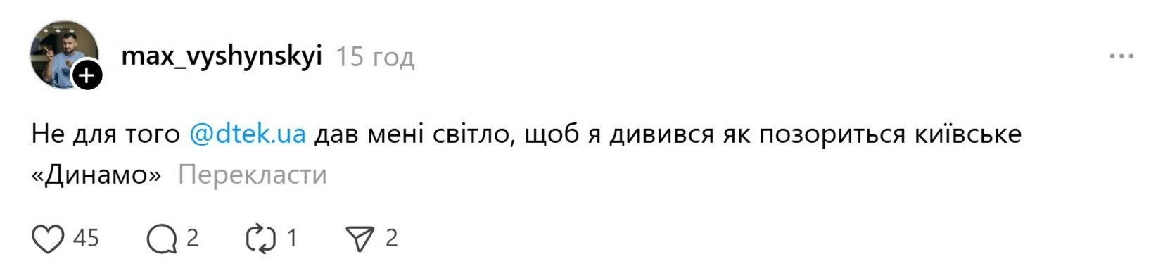 Його колега-стендапер Максим Вишинський також іронізує щодо підопічних Шовковського: "Не для того ДТЕК дав мені світло, щоб я дивився, як ганьбиться київське Динамо".
