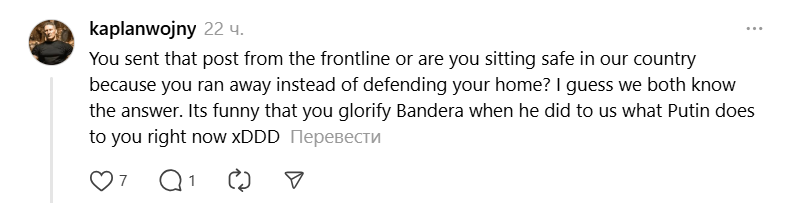 - "Смішно, що ви прославляєте Бандеру, коли він зробив з нами те, що Путін робить з вами зараз".