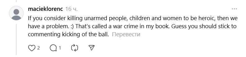 - "Якщо ви вважаєте вбивство беззбройних людей, дітей і жінок героїзмом, то у нас проблема. У мене це називається воєнним злочином".