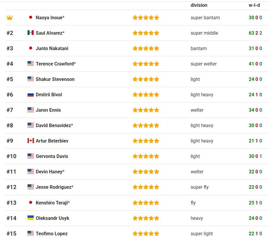 Лідером рейтингу є абсолютний чемпіон світу у другій найлегшій вазі японець Наоя Іноуе. У трійці також розташувалися Сауль Альварес і Дзюнто Накатані.