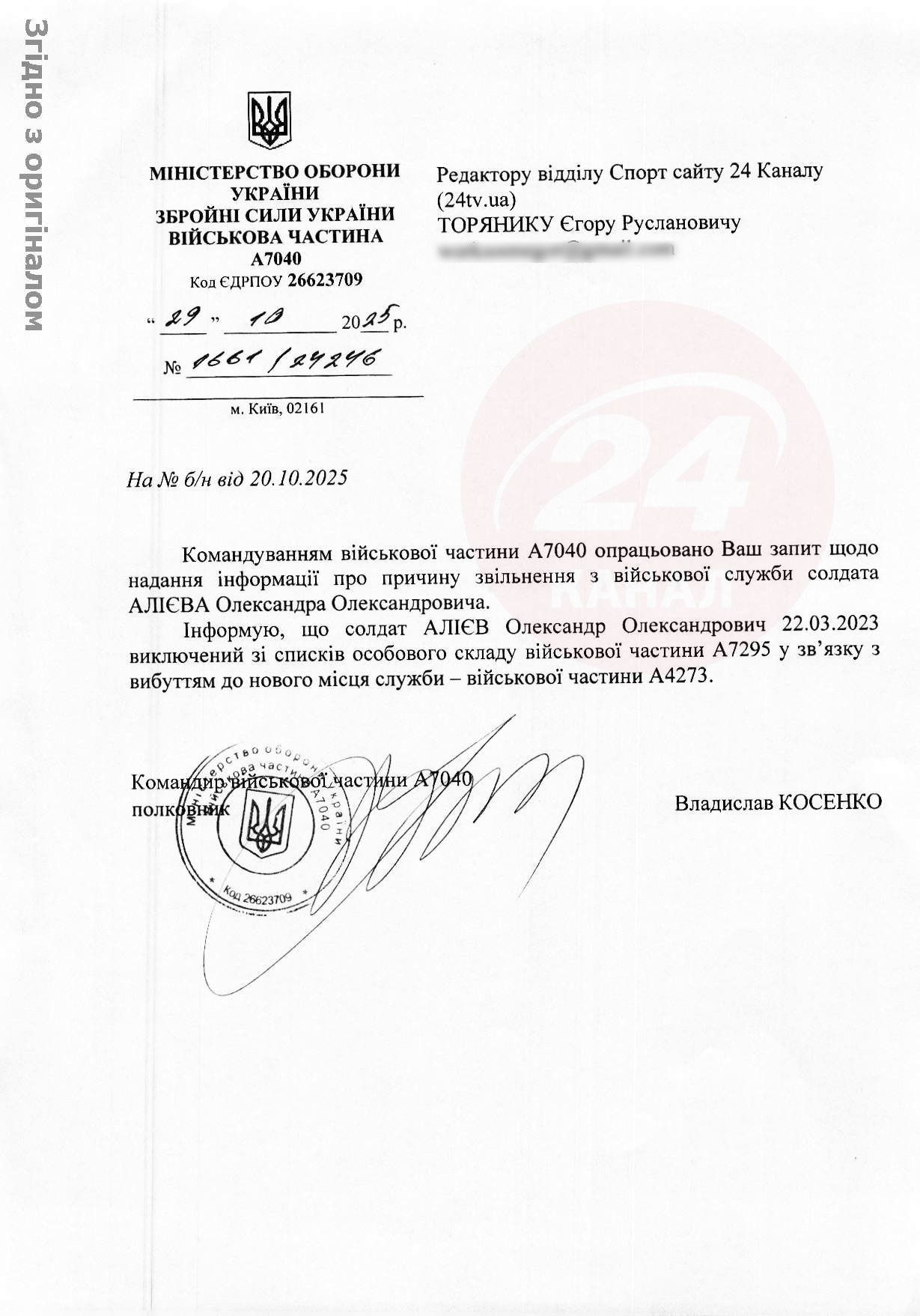 Официальный ответ 112-й бригады об увольнении Алиева / Фото 24 Канала