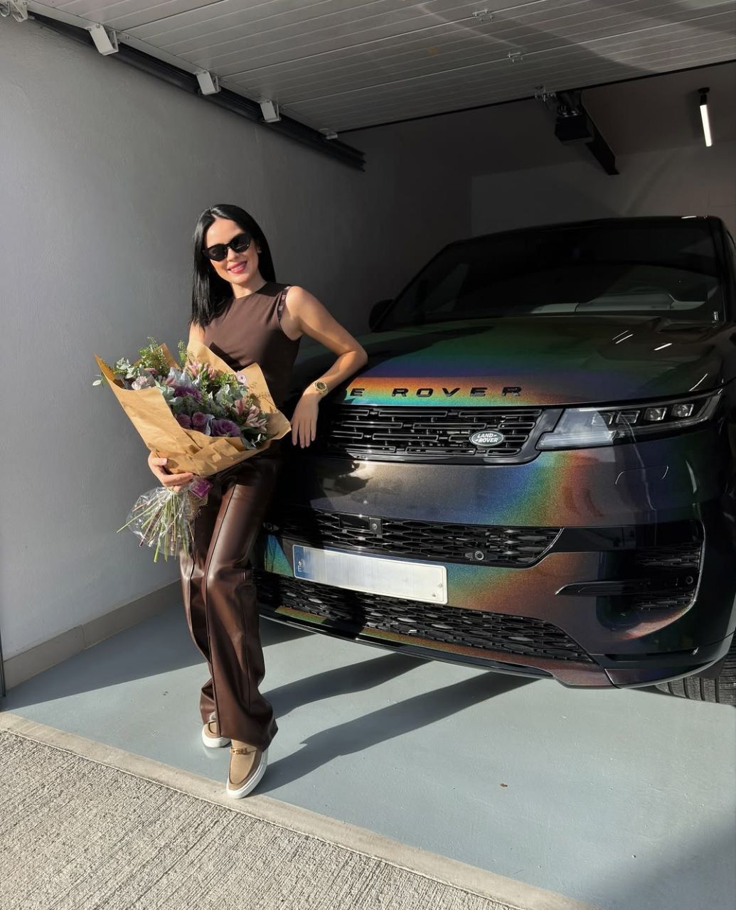 Анастасия опубликовала фото, где она позирует с невероятным букетом цветов на фоне автомобиля модели Land Rover Range Rover. Машина затонирована, полностью в черном цвете, однако красиво переливается на солнце радугой.