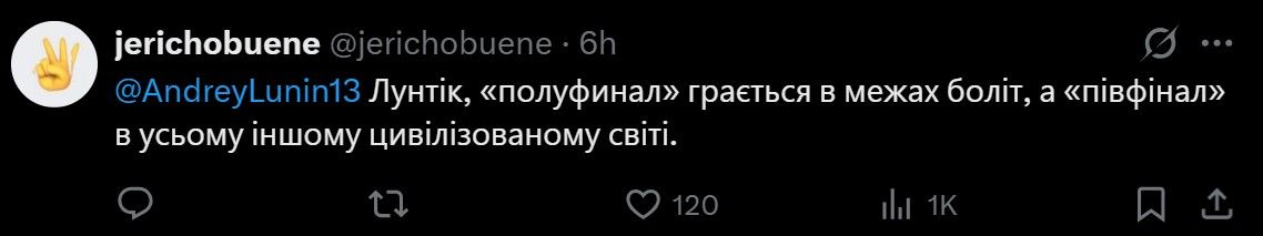 Интересно, что подпись "півфінал" на видео была на украинском. Да и флаг самой Украины. Неудивительно, что на фоне войны с Россией футбольные фанаты выразили возмущение переходом Лунина на язык оккупантов и посмеялись над ним.
