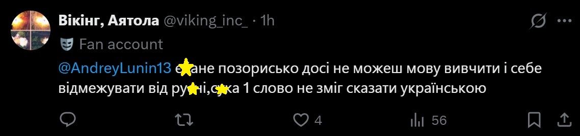 - "Еб*ное позорище, до сих пор не можешь язык выучить и себя отграничить от ру*ни, с*ка 1 слово не смог сказать на украинском"