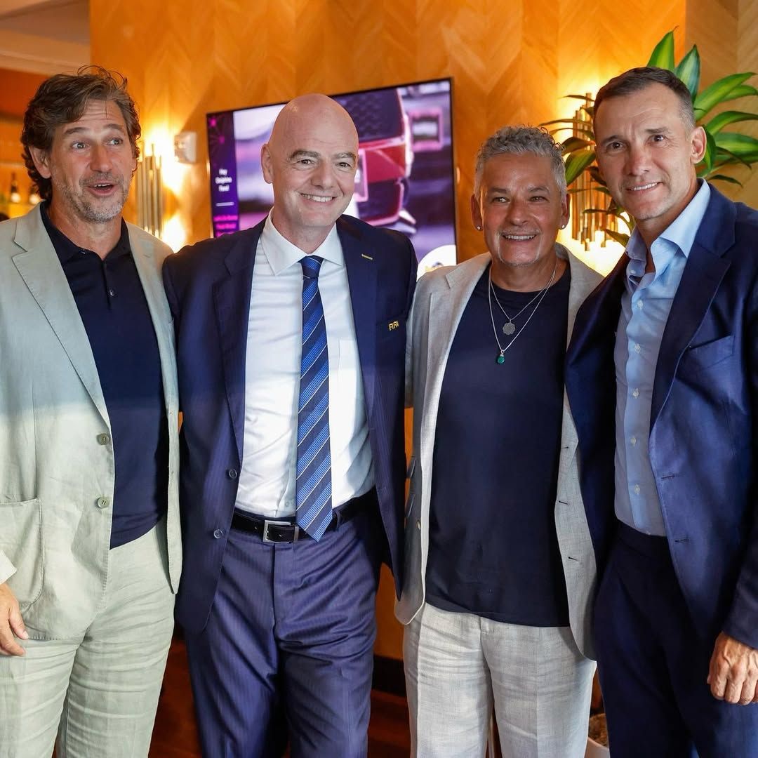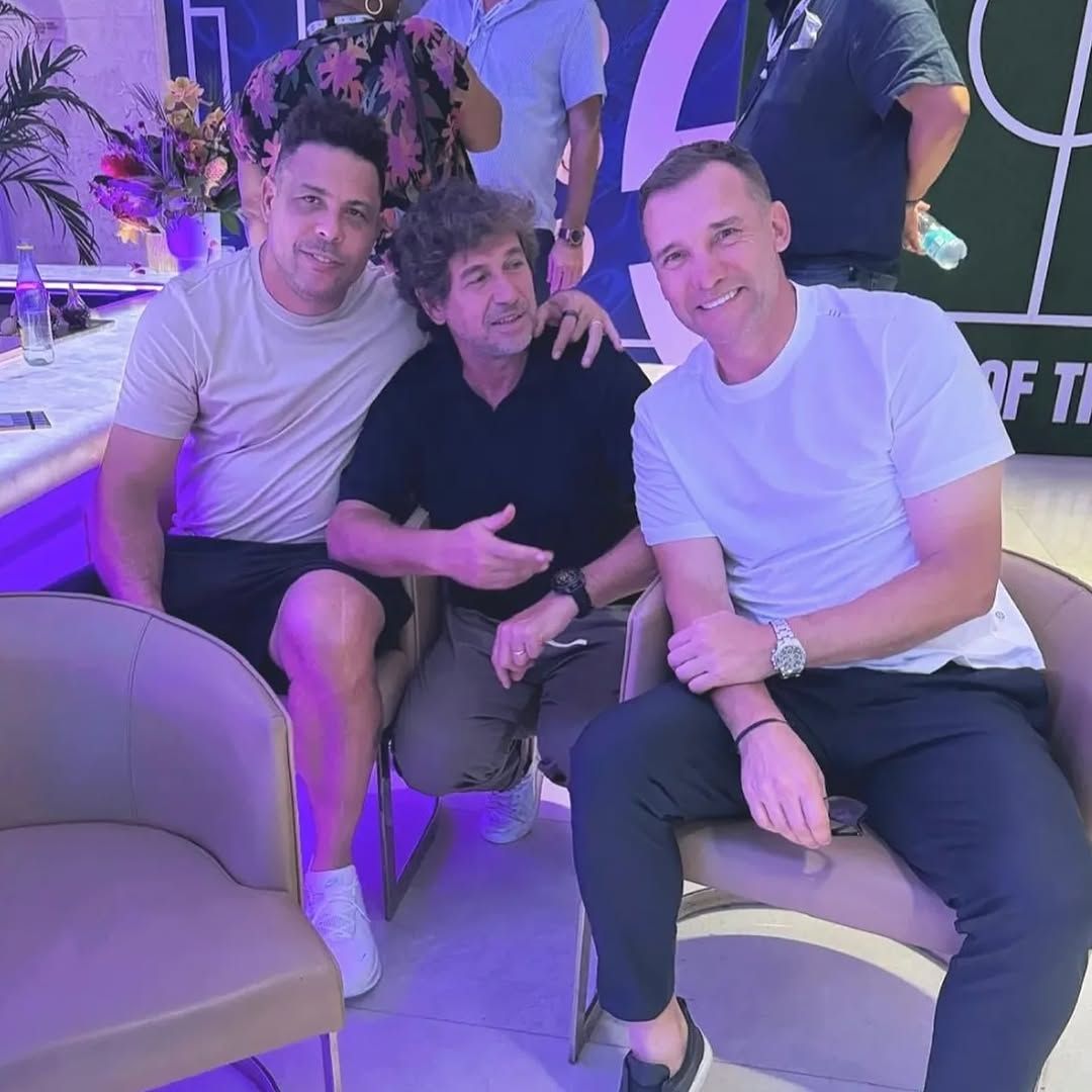 На фотографиях рядом с Шевченко можно увидеть главу ФИФА Джанни Инфантино, экс-форварда сборной Бразилии Роналдо, легенду Италии Роберто Баджо, экс-хавбека Милана Деметрио Альбертини, бывшего нападающего Ювентуса и Интера Кристиана Виери.