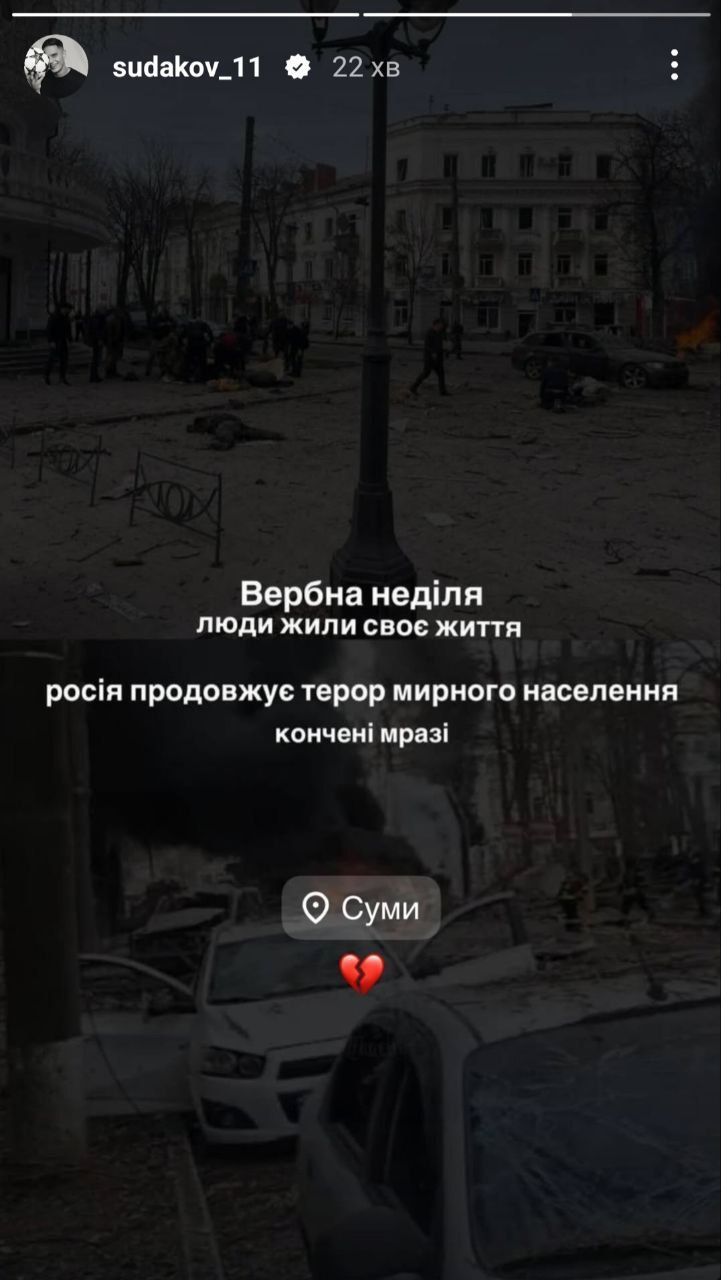 Лидер донецкого Шахтера Георгий Судаков в инстаграме показал последствия преступления россиян. Полузащитник "горняков" напомнил, что оккупанты нанесли удар по Сумам в Вербное воскресенье.