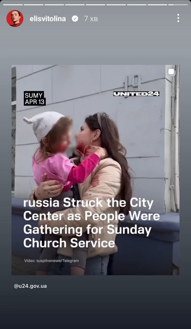 Россия нанесла удар баллистической ракетой по центру Сум в Вербное воскресенье, когда десятки тысяч человек были на улицах. К настоящему моменту подтверждена гибель 20 человек. Невозможно смотреть на это и осознавать, что такие ужасные, бесчеловечные вещи происходят в моей стране. Остановите убийства украинцев,