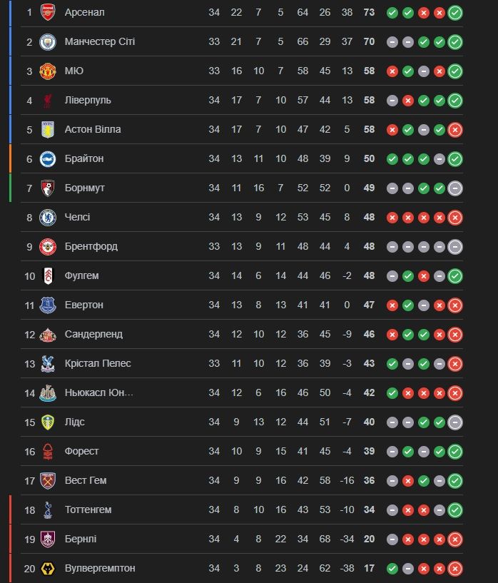 Как выглядит турнирная таблица АПЛ по состоянию на 23:00 25 апреля 2026 года