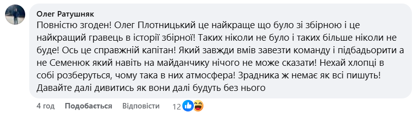- "Полностью согласен! Олег Плотницкий это лучшее что было со сборной и это лучший игрок в истории сборной! Таких никогда не было и таких больше никогда не будет! Вот это настоящий капитан! Который всегда умел завезти команду и подбодрить, а не Семенюк который даже на площадке ничего не может сказать! Пусть ребята в себе разберутся, почему такая у них атмосфера! Предателя же нет как все пишут! Давайте дальше смотреть как они дальше будут без него".