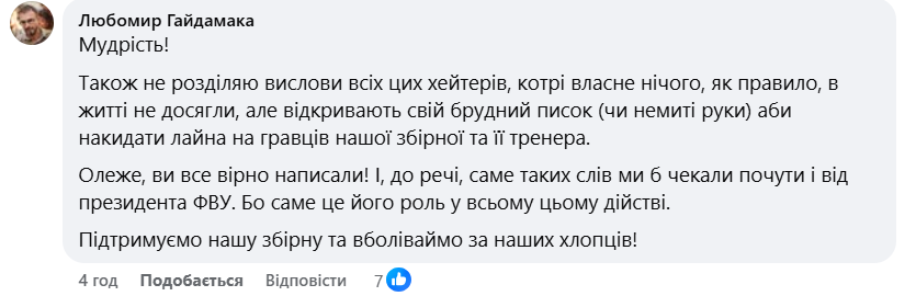 - "Мудрость! Также не разделяю высказывания всех этих хейтеров, которые собственно ничего, как правило, в жизни не достигли, но открывают свой грязный писок (или немытые руки) чтобы набрасывать дерьма на игроков нашей сборной и ее тренера.