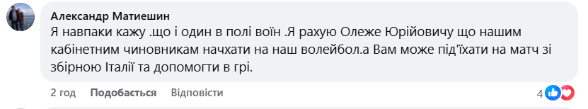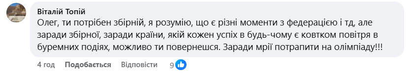 Олег, вы все верно написали! И, кстати, именно таких слов мы бы ждали услышать и от президента ФВУ. Потому что именно это его роль во всем этом действе. Поддерживаем нашу сборную и болеем за наших ребят!". - "Олег, ты нужен сборной, я понимаю, что есть разные моменты с федерацией и тд, но ради сборной, ради страны, которой каждый успех в чем-либо является глотком воздуха в бурных событиях, возможно ты вернешься. Ради мечты попасть на олимпиаду!!!".