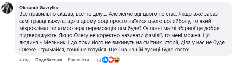 - "Все правильно сказал, все по делу.... Но легче от этого не становится. Если уже сейчас сами игроки говорят, что в этом году просто наелись этого волейбола, то какой микроклимат или атмосфера победителей там будет? Последние матчи сборной это хорошо подтверждают. Если Олегу не корректно называть фамилии, то мне можно. Этот человек - Мельник. И до пока его не выбросят на свалку истории, дела у нас не будет. Олег – держись, точнее готовься. Еще и на нашей улице будет праздник!"