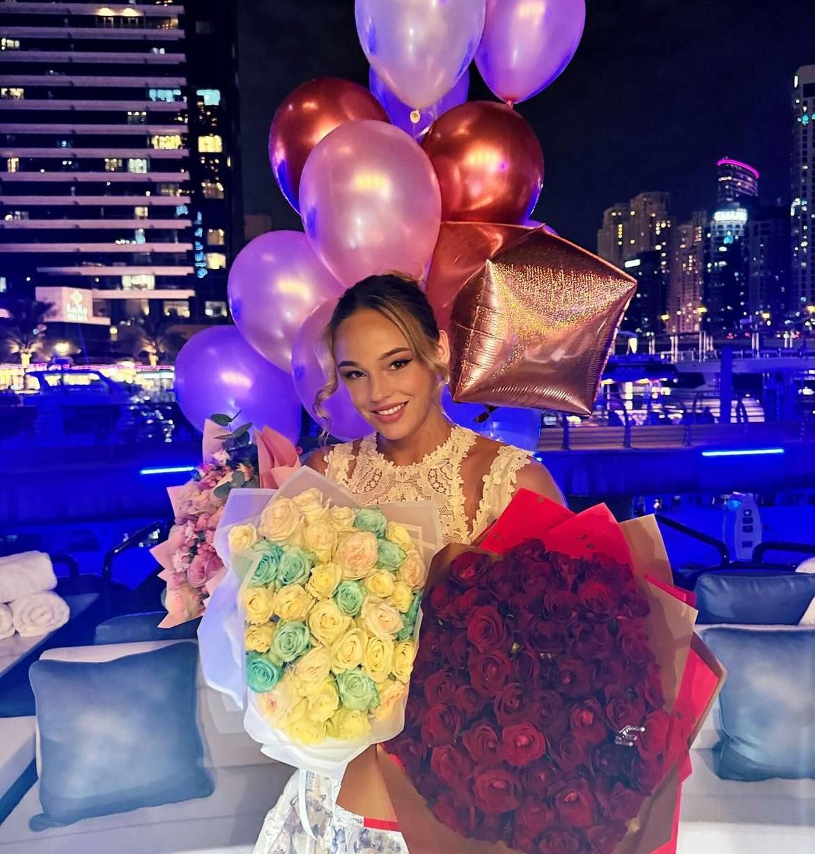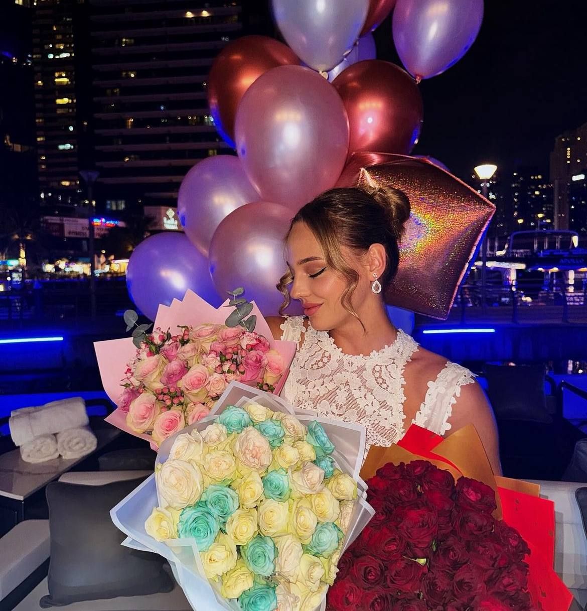 Дарья поделилась фотографиями в очень стильном образе, позируя с большим количеством цветов, которую получила в подарок.