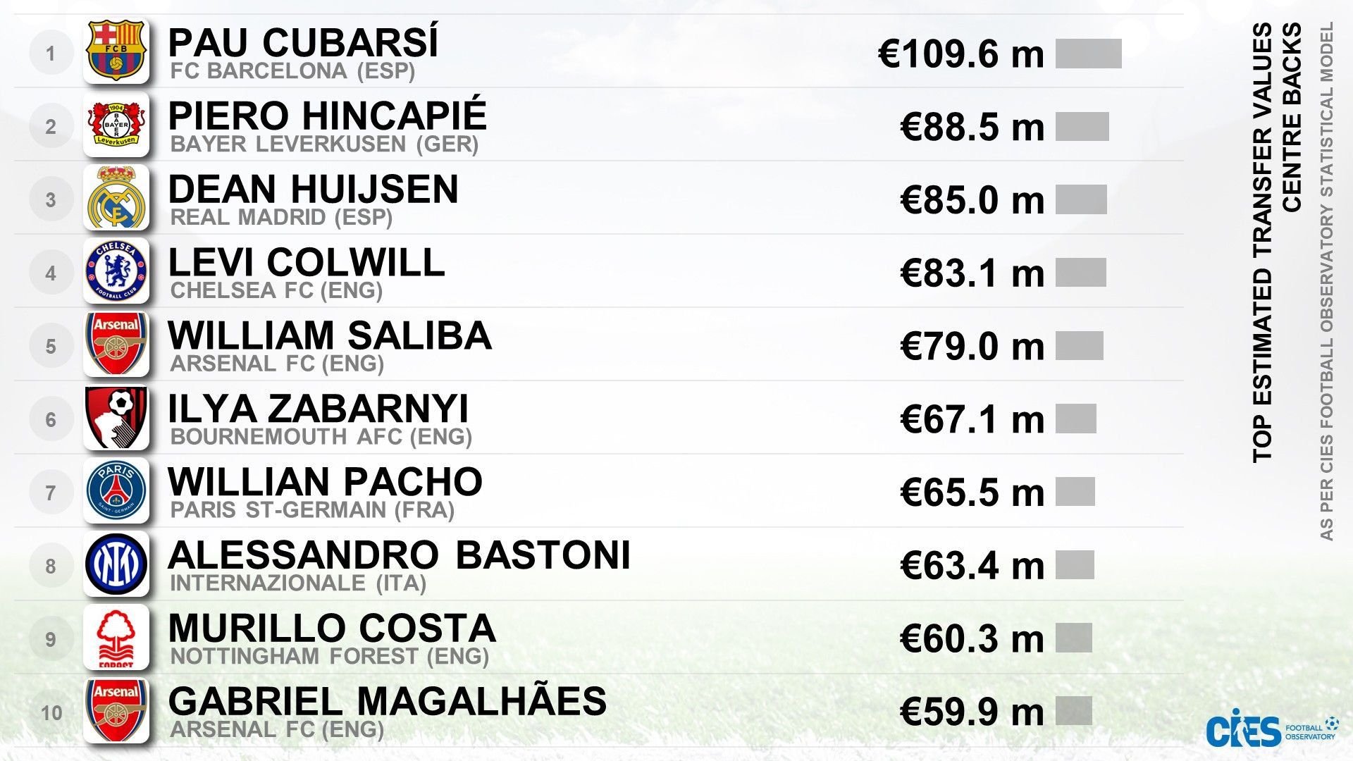 Первое место рейтинга занял игрок Барселоны Пау Кубарси, стоимость которого, по версии СIES, составляет 109,6 миллионов евро.