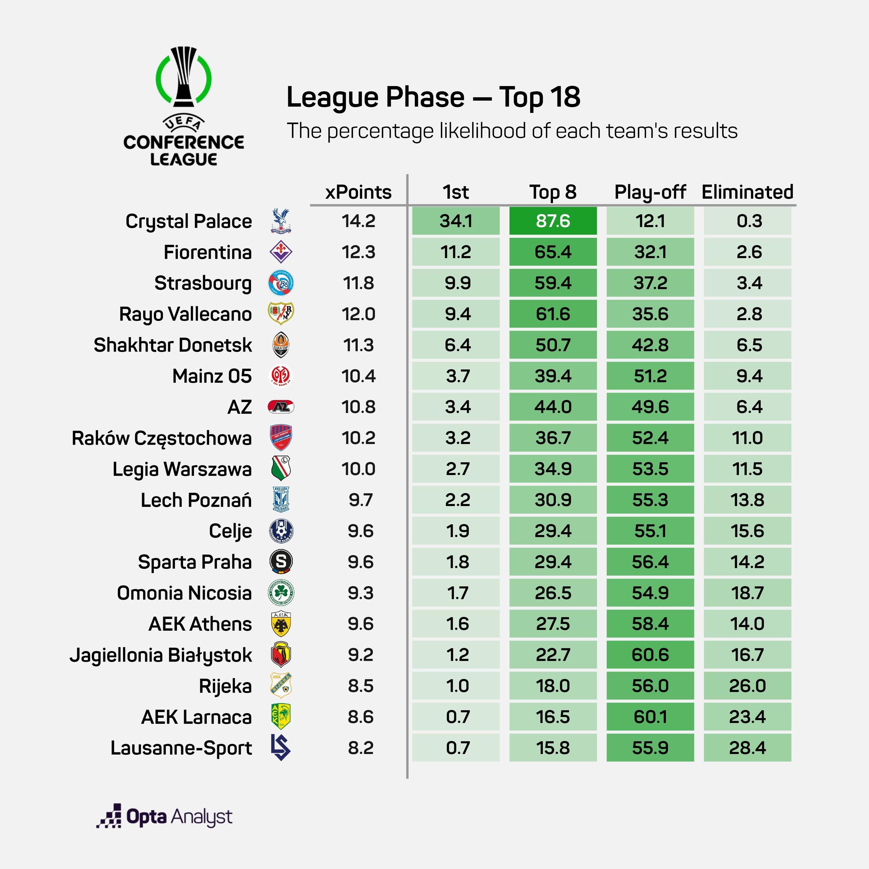Шансы всех клубов на победу в Лиге конференций / Изображение из соцсетей Opta