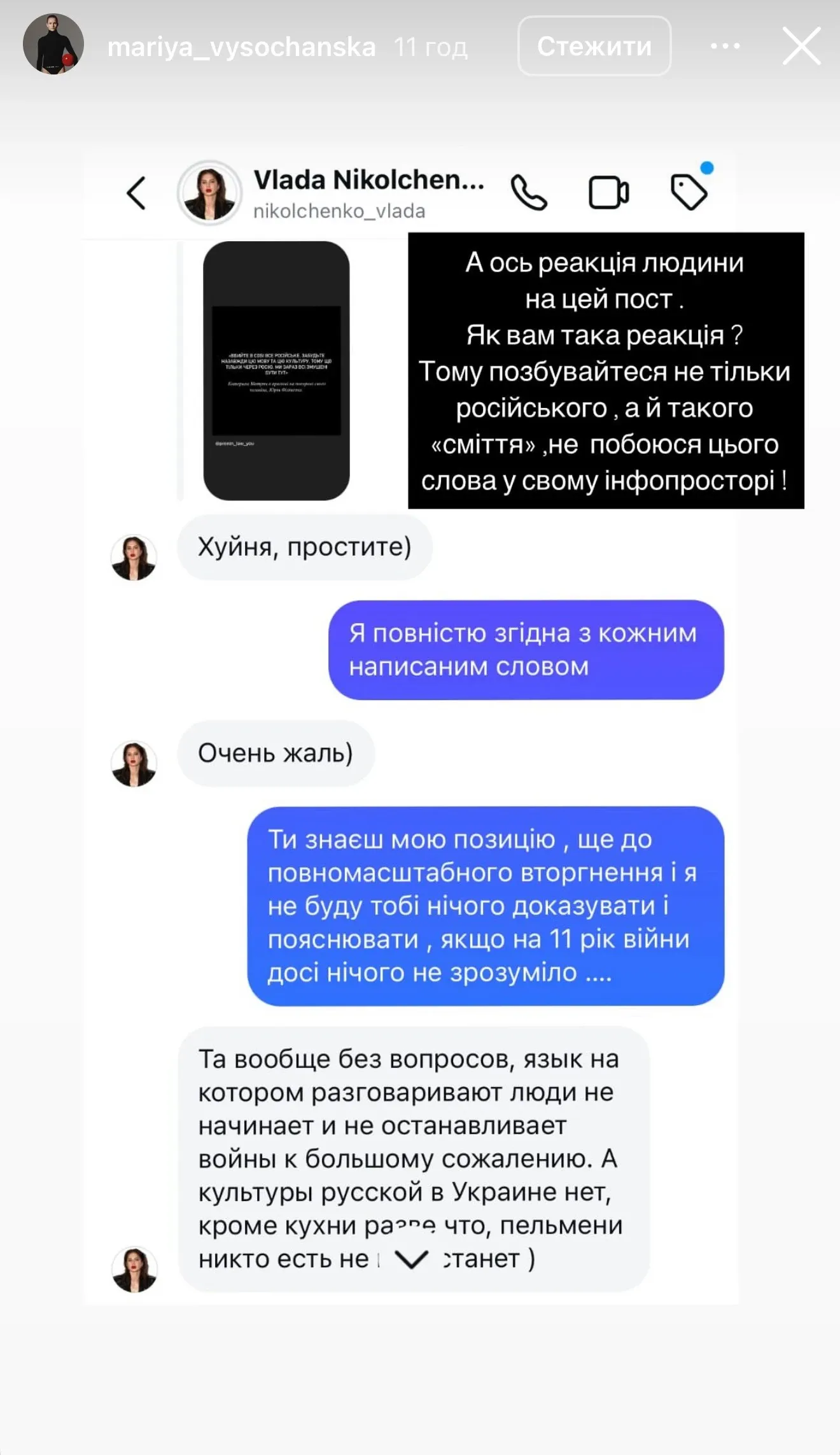 Также в следующем рассказе она опубликовала скриншот частной переписки с Никольченко, где та отвечает на сторис с речью жены погибшего защитника Украины.