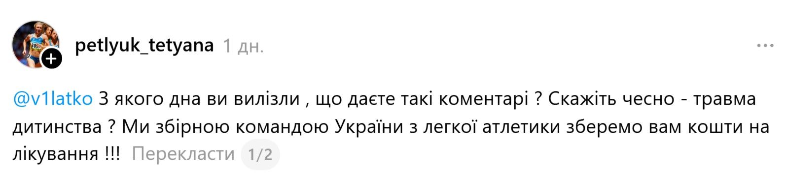 С какого дна вы вылезли, что даете такие комментарии? Скажите честно, это травма детства? Мы со сборной командой Украины по легкой атлетике соберем вам средства на лечение,
