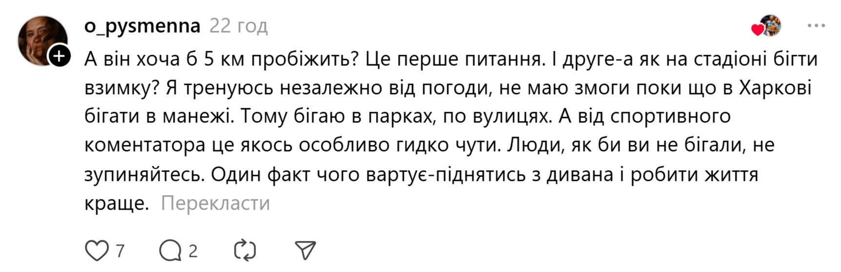 - А он хотя бы 5 км пробежит? И как на стадионе бежать зимой? Я тренируюсь независимо от погоды, не имею возможности пока что в Харькове бегать в манеже. Поэтому бегаю в парках. А от спортивного комментатора это как-то особенно противно слышать.